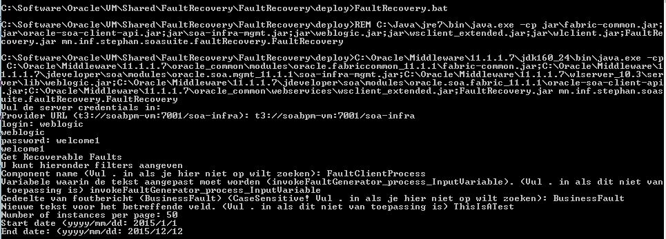 As a every IT guy picking up something new, I asked my good friend Google if he knew more about the subject of SOA Fault Recovery. And after some clicks I found both Rafael Andrade’s blog(Verwijst naar een externe website) and the Oracle ‘documentation’ on the “Oracle Fusion Middleware Infrastructure Management Java API Reference for Oracle SOA Suite 11g Release 1 (11.1.1)(Verwijst naar een externe website)“. Quite a mouth full!