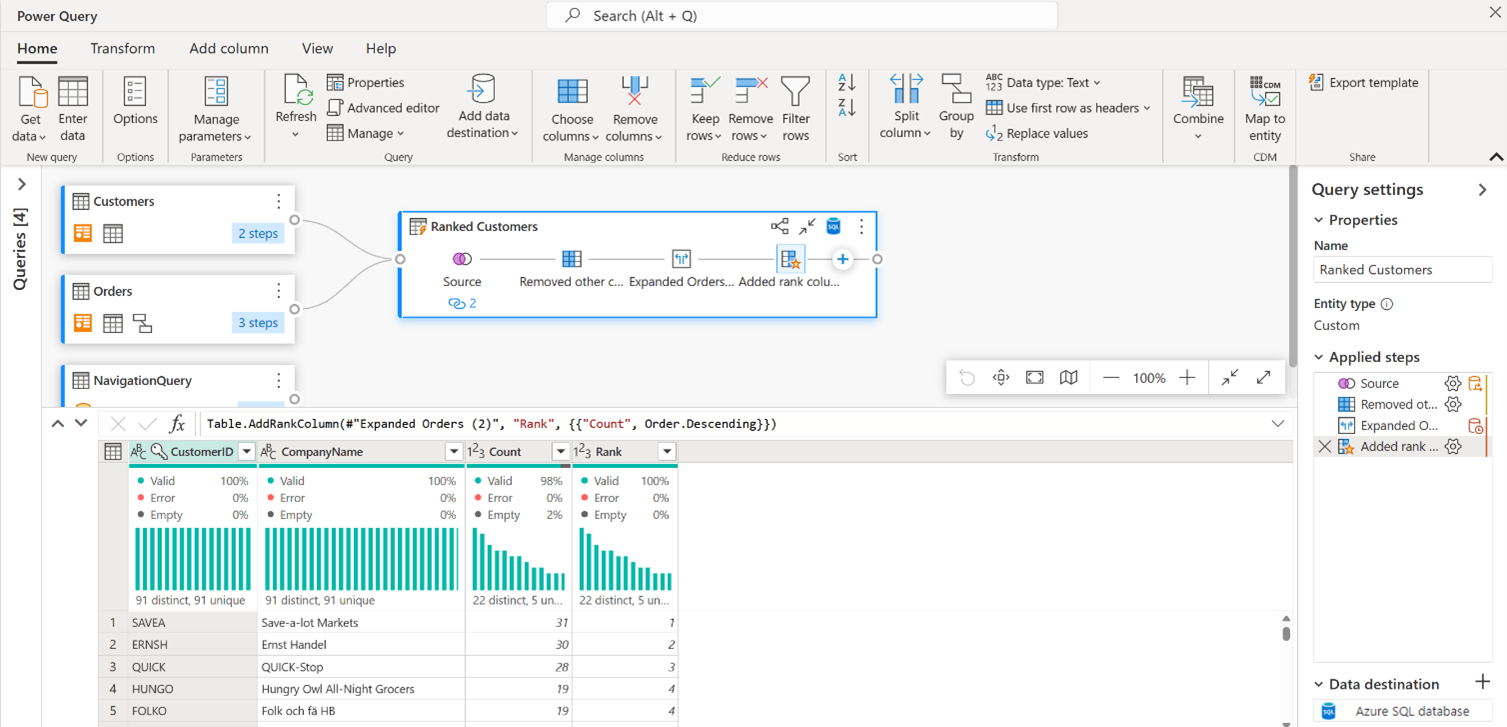 Een voordeel van de dataflow is dat deze een grafische interface heeft, waarbij elke stap in het ETL-proces direct inzichtelijk is (vergelijkbaar met de Power Query editor in Power BI). Voor het inladen van de data kan gebruik gemaakt worden van een groot aantal standaard connectoren voor zowel on-prem data (via de gateway) als cloud-bronnen. Data-transformaties kunnen via de interface worden gedaan, maar indien gewenst kan de gebruiker ook zelf de Power Query formuletaal (M) invoeren of aanpassen via de “advanced editor”. Dit alles maakt deze methode erg geschikt voor gebruikers met een wat minder technische achtergrond en gebruikers die vanuit Power BI naar Fabric overstappen.