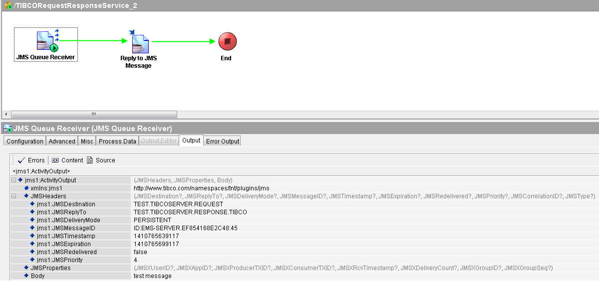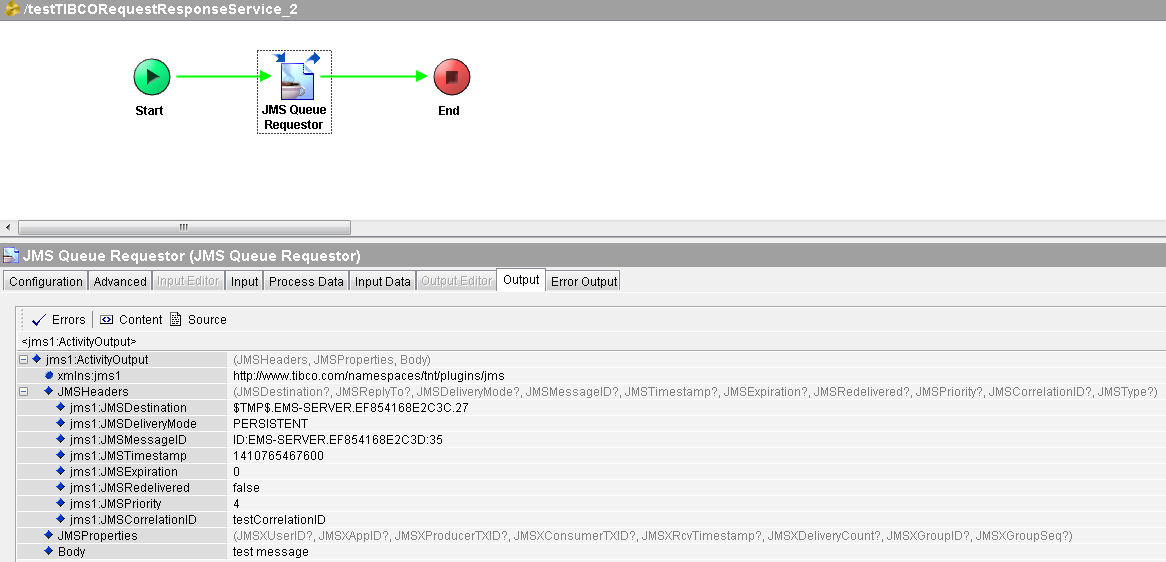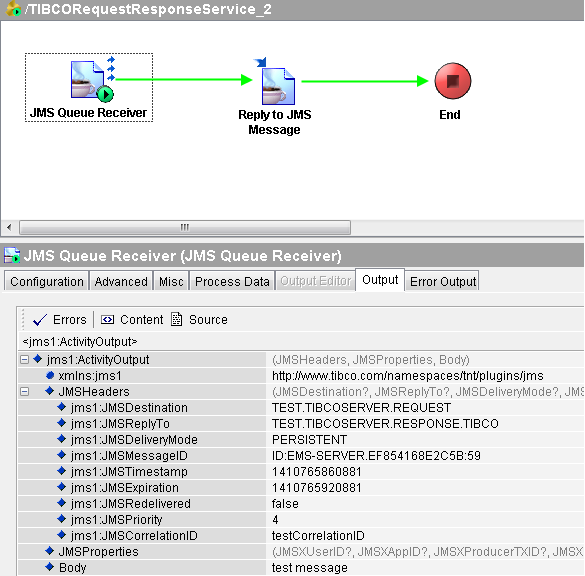 When looking at the output of the Get JMS Queue Message activity we see the CorrelationID property is filled with: ‘ID:EMS-SERVER:EF854168E2C48:45’ And the JMSDestination is set to the value we provided in the request. EMS also provided a new unique MessageID property.