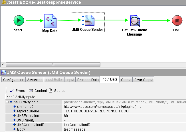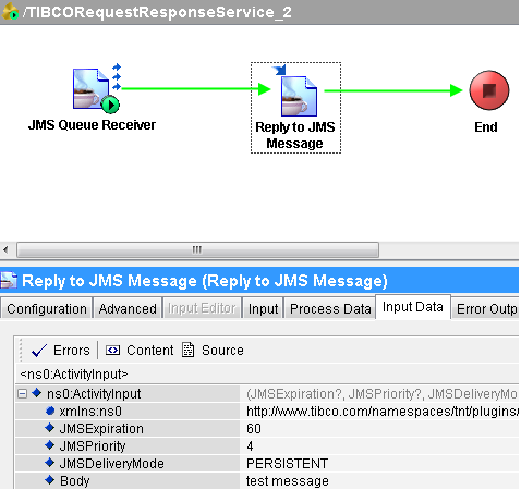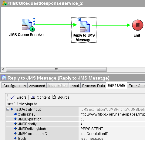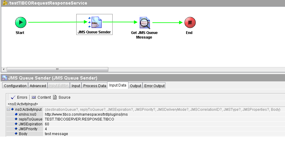 Below we are looking at the input data of the JMS Queue Sender. Note the replyToQueue field is test the response queue we would like to receive our response, this field will translate to the JMSReplyTo property in our JMS message. (and yes, it would have probable made sense to also call the field JMSReplyTo….yeah…hmmz…) Also note the MessageID is not provided in TIBCO BW, this property is set by TIBCO EMS.