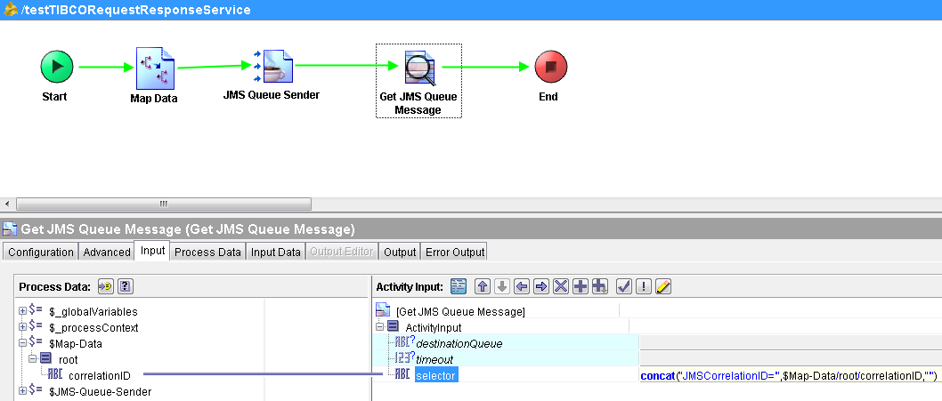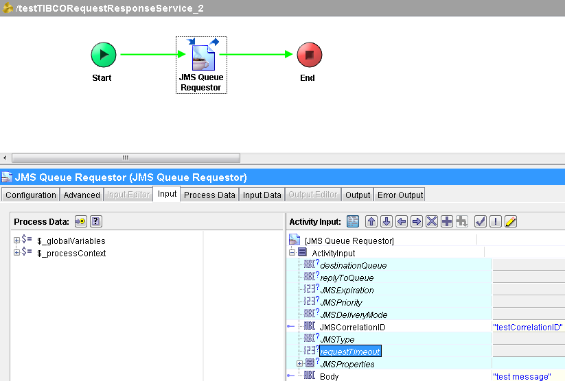 Below we are looking at the input tab of this JMS Queue Requestor activity. We provide the correlationID we want to use for this message.