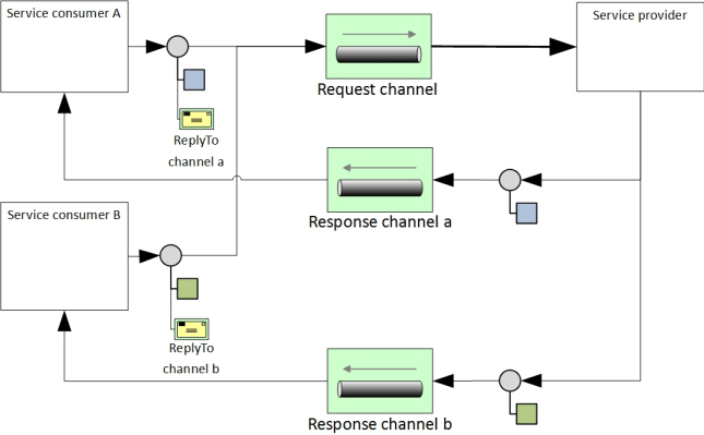 In the CorrelationID pattern the service consumer must provide a unique CorrelationID. The service provider will copy the CorrelationID it received into the CorrelationID of the response message. All response messages will go to the same response destination.