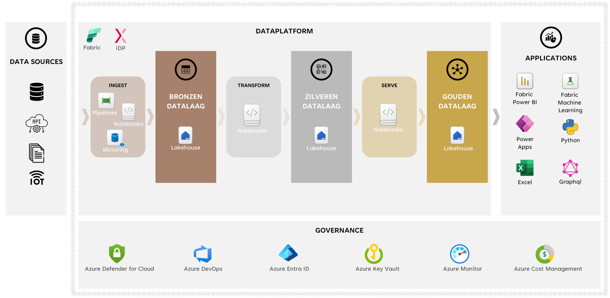 De technische en functionele basis van iDP Fabric is de medallion-architectuur zoals die ook binnen Microsoft Fabric wordt aanbevolen. Dit betekent dat data wordt verwerkt via drie lagen: brons, zilver en goud.