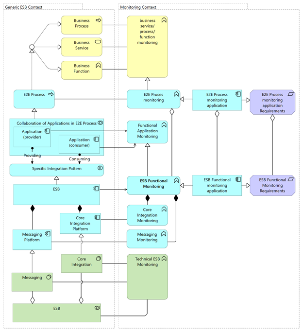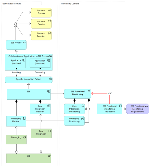 - Concurrently, this ESB Functional Monitoring application also implements the ArchiMate function of ESB Functional Monitoring. Sadly however, the “chosen” application does not monitor the messaging part of the ESB and sadly too, ArchiMate does not have a way to show what you don’t want or what should but isn’t. Fortunately, the tool I used allows for highlighting with color and text. Though only the text will show up in other views.