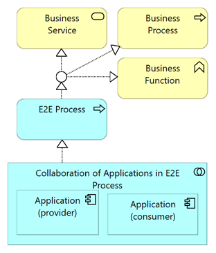 Here is my first step of setting up an integration architecture view in ArchiMate. I’ve aggregated a generic provider and consumer (both applications), who collaborate in some way in order to fulfill some E2E application process: