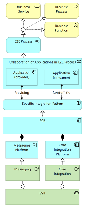 Note that I’ve explicitly used the composition relation between the ESB and the underlying applications, in a clear but futile effort to disallow not-so-integration-savvy(solution)architects use these underlying applications directly and independently from the ESB. - At the technology layer each of the two platforms could be of separate nature (software / vendor) but in the end, conceptually they form, again, a collaboration.