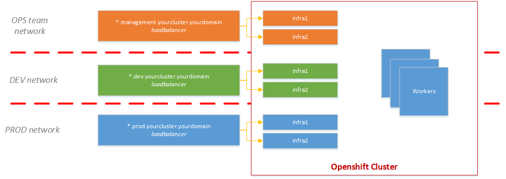 This will create two additional ingress controllers: ‘dev’ and ‘prod’ in the ‘openshift-ingress-operator’ namespace. The ‘domain’ section for each ingress controller matches the FQDN on the loadbalancer (with the wildcard CNAME) and the router pods are only pushed to the infra nodes with the proper label.