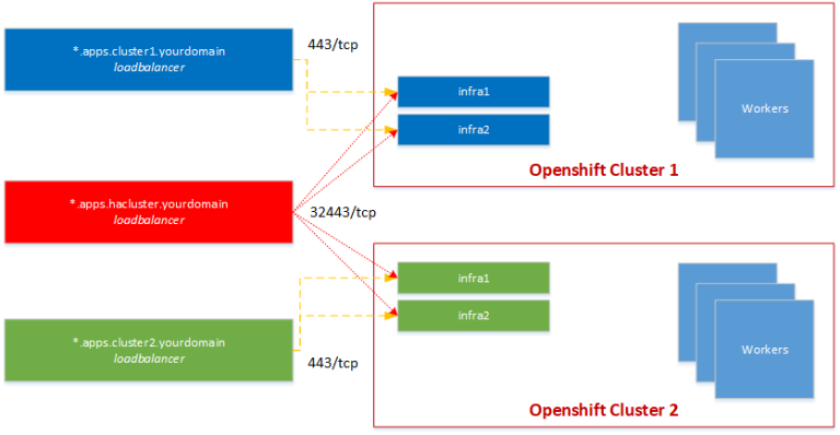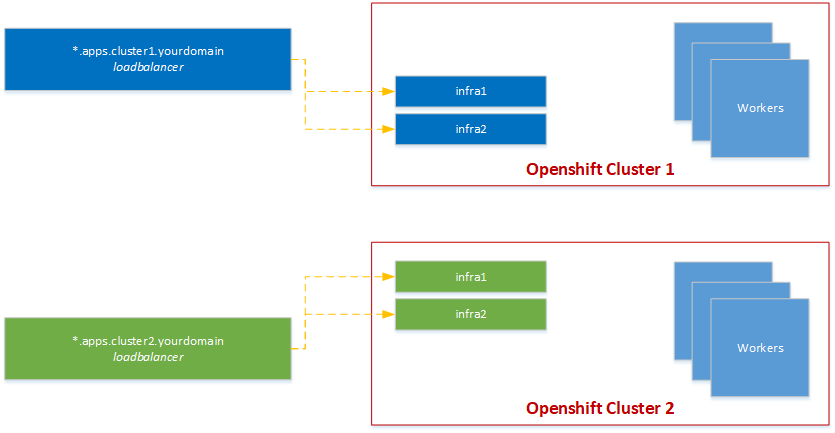 In my previous post I’ve described how you can set up multiple infranodes with multiple ingress controllers, just in case you have to deal with some existing networks. But what if you’re perfectly happy with the default ingress controller and instead, you want to spread out your traffic on to multiple Openshift clusters? This blogpost describes how to set up multiple ingress controllers on the same infranodes using the NodePortService Strategy.